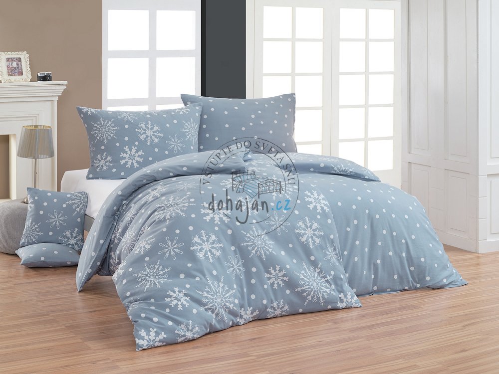 Povlak na polštář i na přikrývku zdobí na vrchní straně motiv sněhových vloček doplněných drobnými puntíky, na spodní straně jsou pouze puntíky na stejnobarevném podkladu.