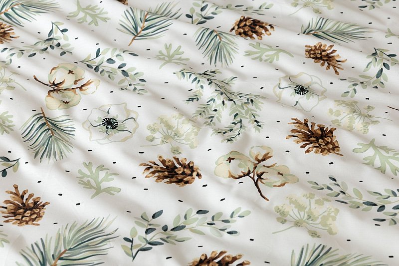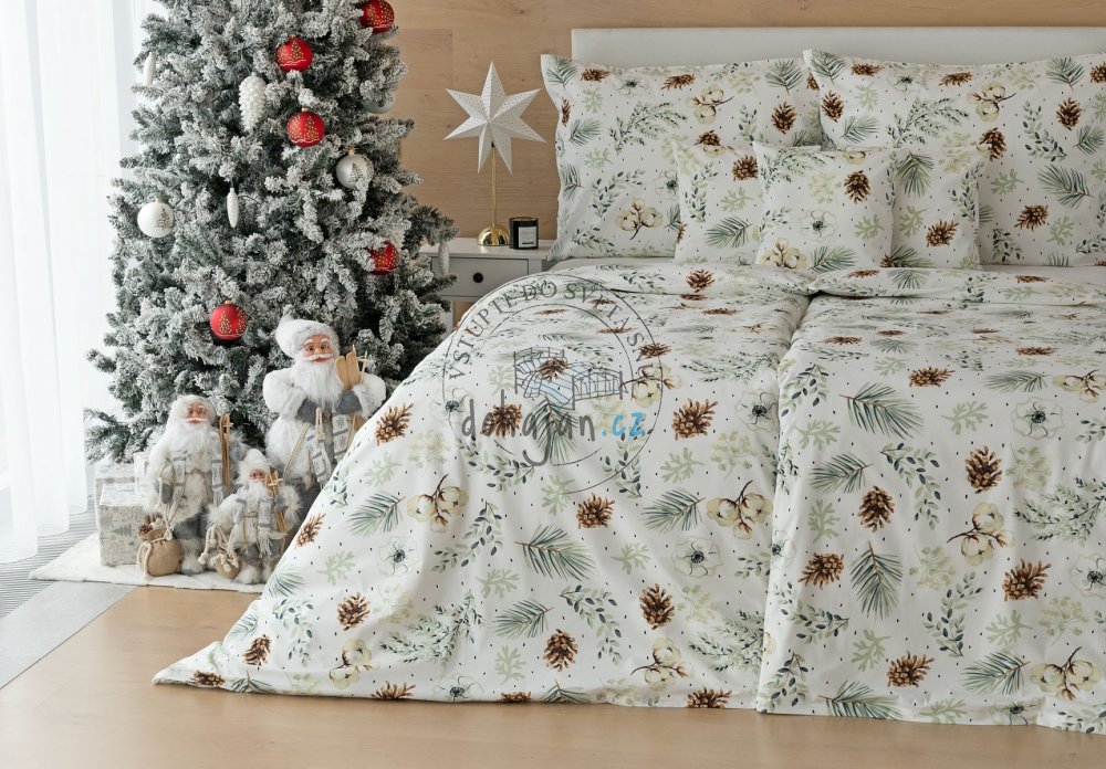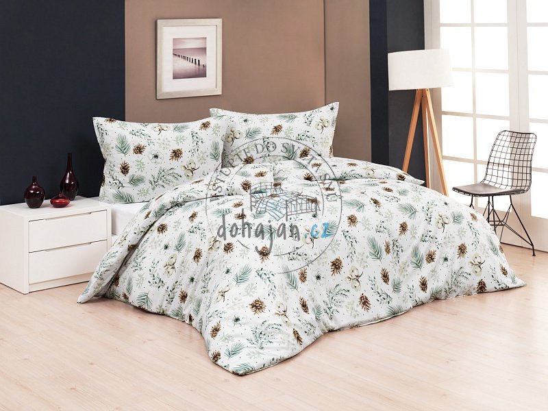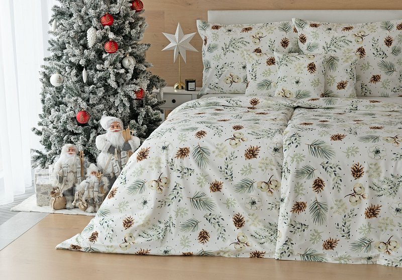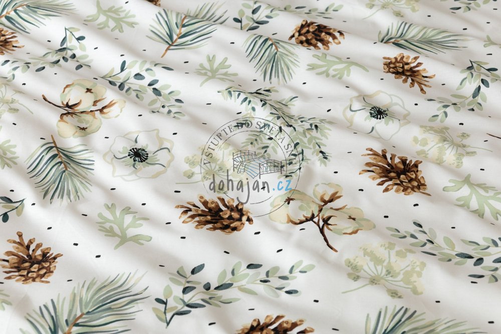 Motiv borových šišek a větviček na krémově bílém podkladu vykouzlí ve vaší ložnici tu pravou sváteční atmosféru.