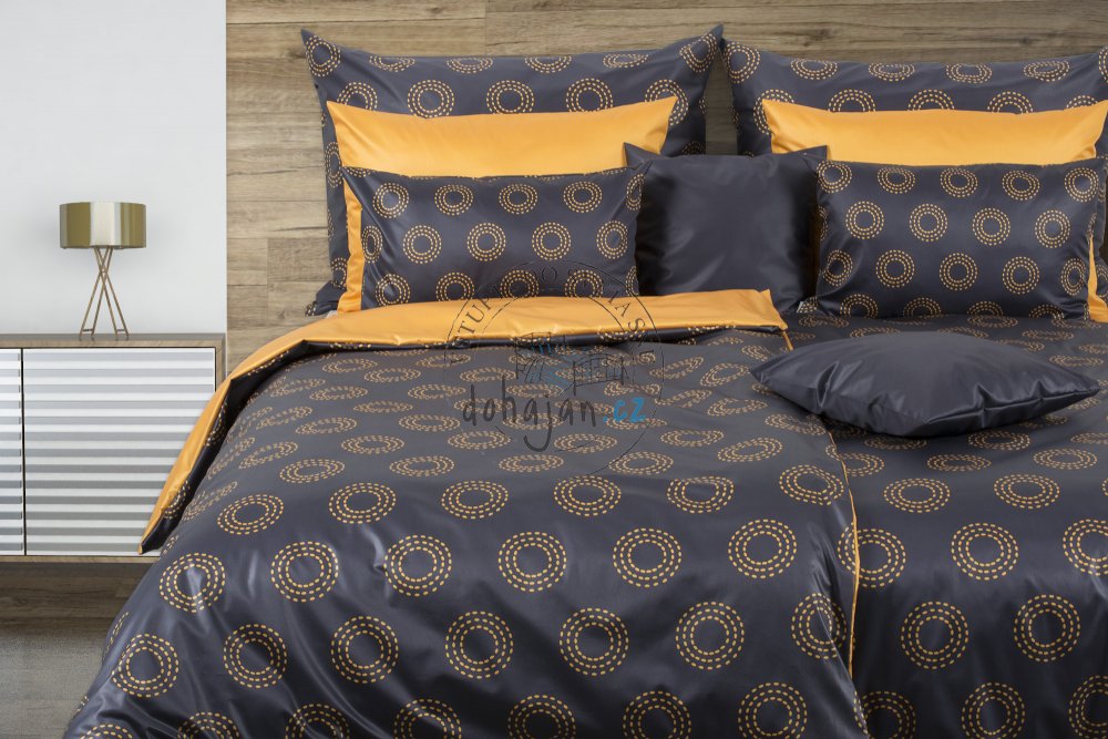 Oboustranné povlečení s puntíky tvořícími kruhy na šedém podkladě v kombinaci se zadní jednobarevnou oranžovou stranou.