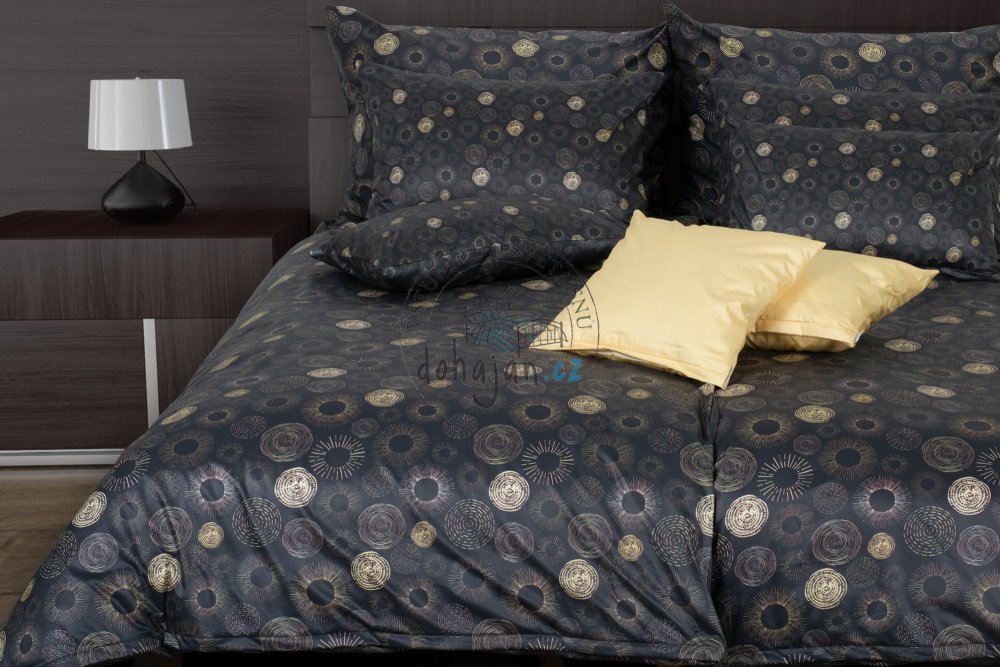 Abstraktní kruhy ve vanilkové barvě rozeseté po celé ploše povlečení šedohnědé barvy.